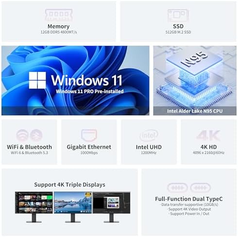 【12th Intel Alder Lake N95】Newest 12th Intel Alder Lake N95 (Up to 3.4GHz) processor. Compared with Intel (N100/N5105/N5100/N5095), N95 CPU performance +35%, GPU +78%.